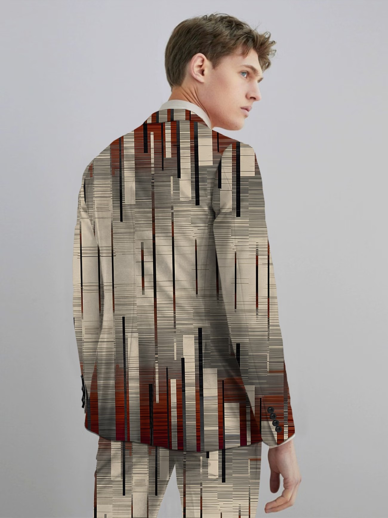 Mobile Preview: 3-teiliges Anzugset für Herren: Anzug mit Weste und Hose, Digitaldruck, ideal für Business und Reisen. Modischer Anzug für Bankette, Hochzeiten und andere festliche Anlässe. Vertikal gestreiftes, geometrisches Muster.
