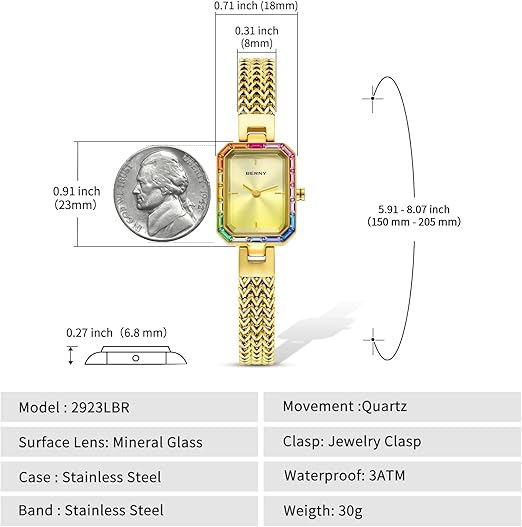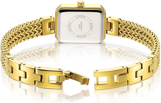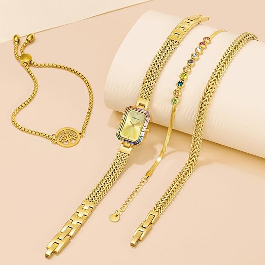 Damenuhr Gold, zierliches Armband, Gehäuse mit farbigen Steinen, 3 ATM wasserdicht, minimalistisches Uhren- und Armbandset