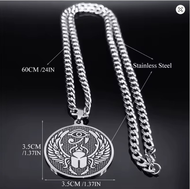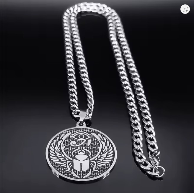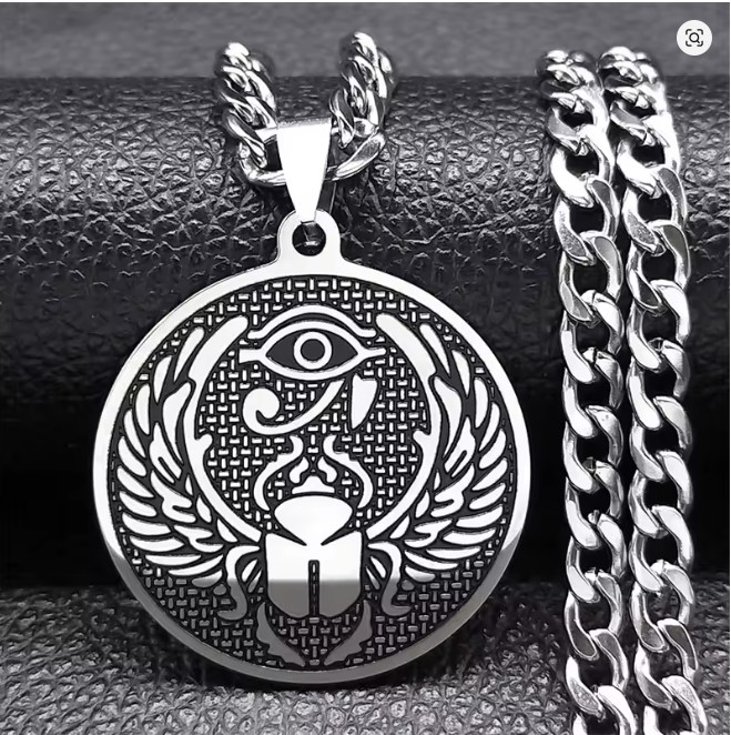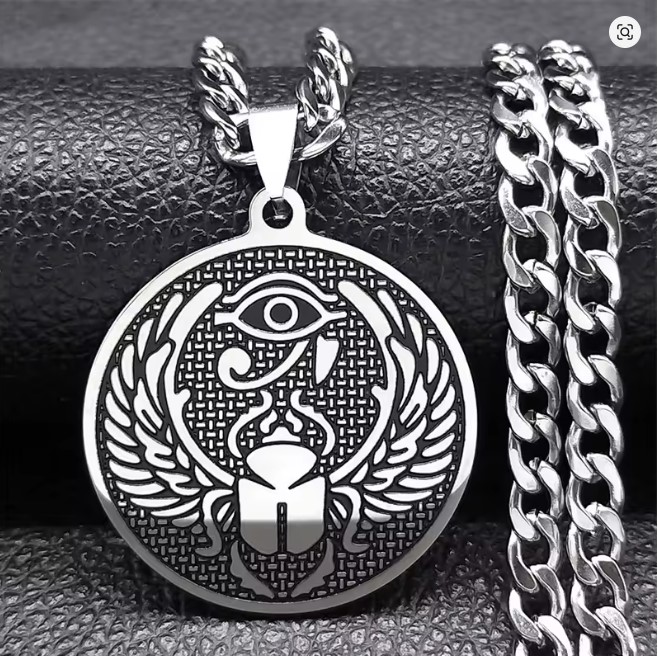 Preview: Halskette mit Horusauge und Skarabäus-Mistkäfer-Amulett für Damen und Herren, Edelstahl, ägyptischer Anhänger, runder Schmuck