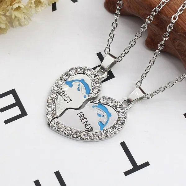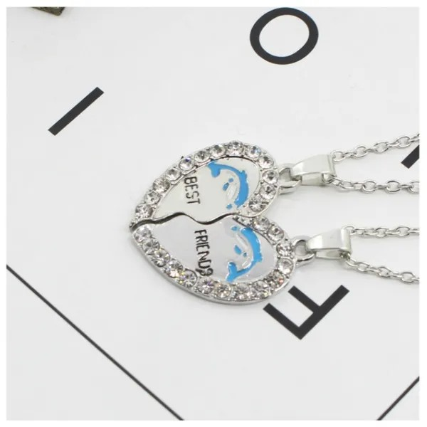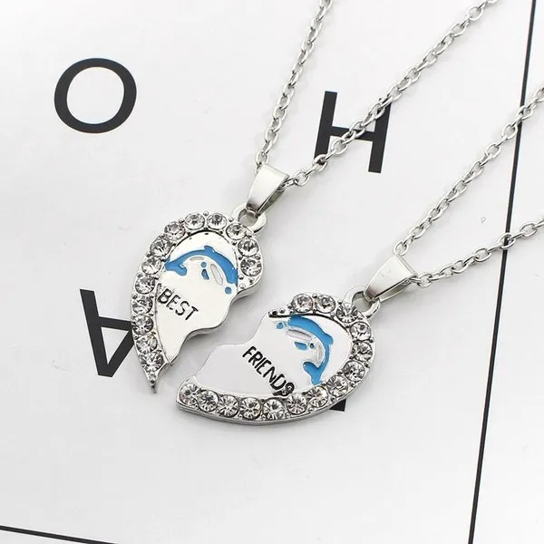 2-teiliges Best Friends Delfin-Halskettenset mit gebrochenem Herzen – Freundschaftsschmuck mit Kristallanhänger