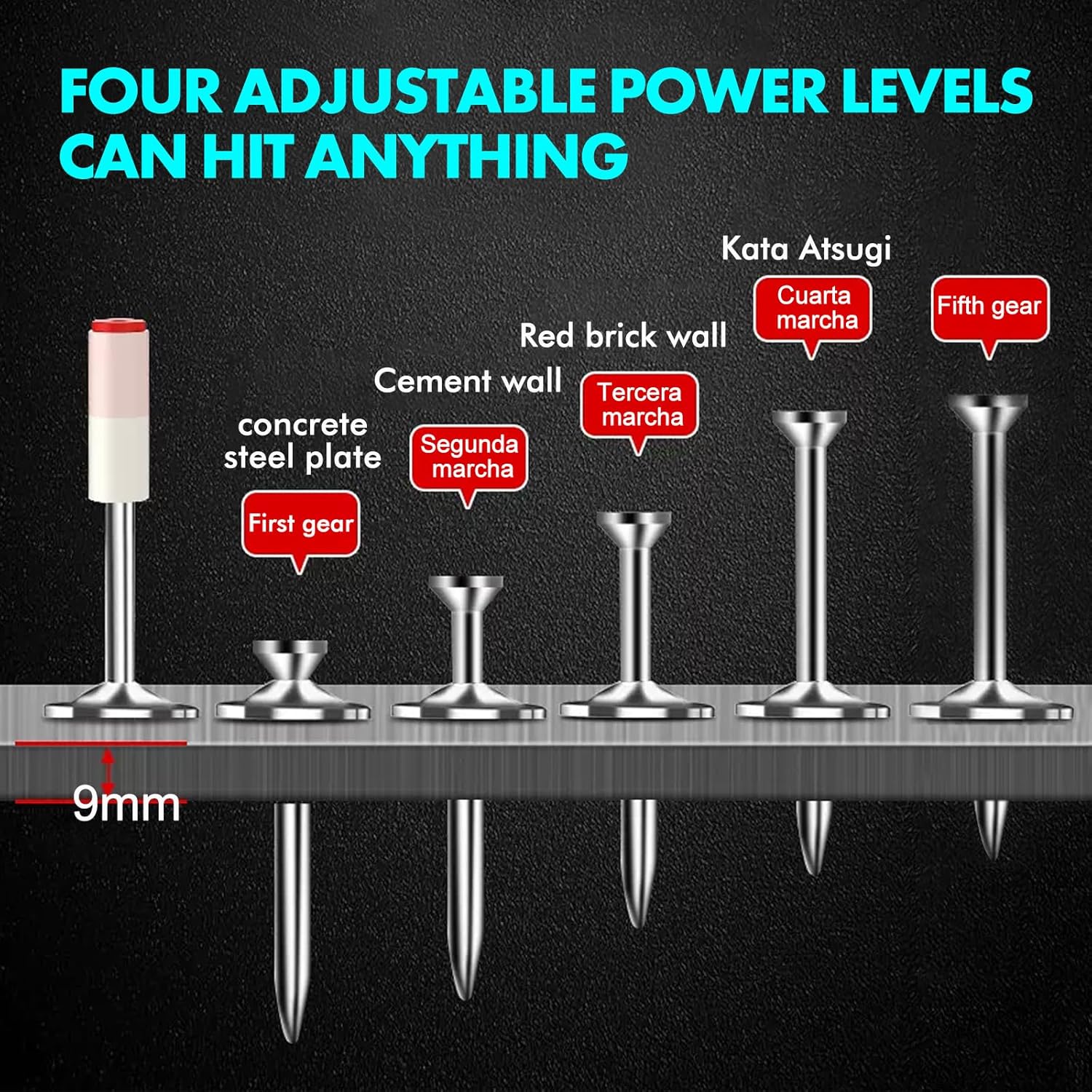 Manuelles Nagelgerät mit Schalldämpfer, 5-stufige Einstellung für Ziegelwände, Betonwände, Kabelkanäle aus Aluminium und dicke Holzplatten