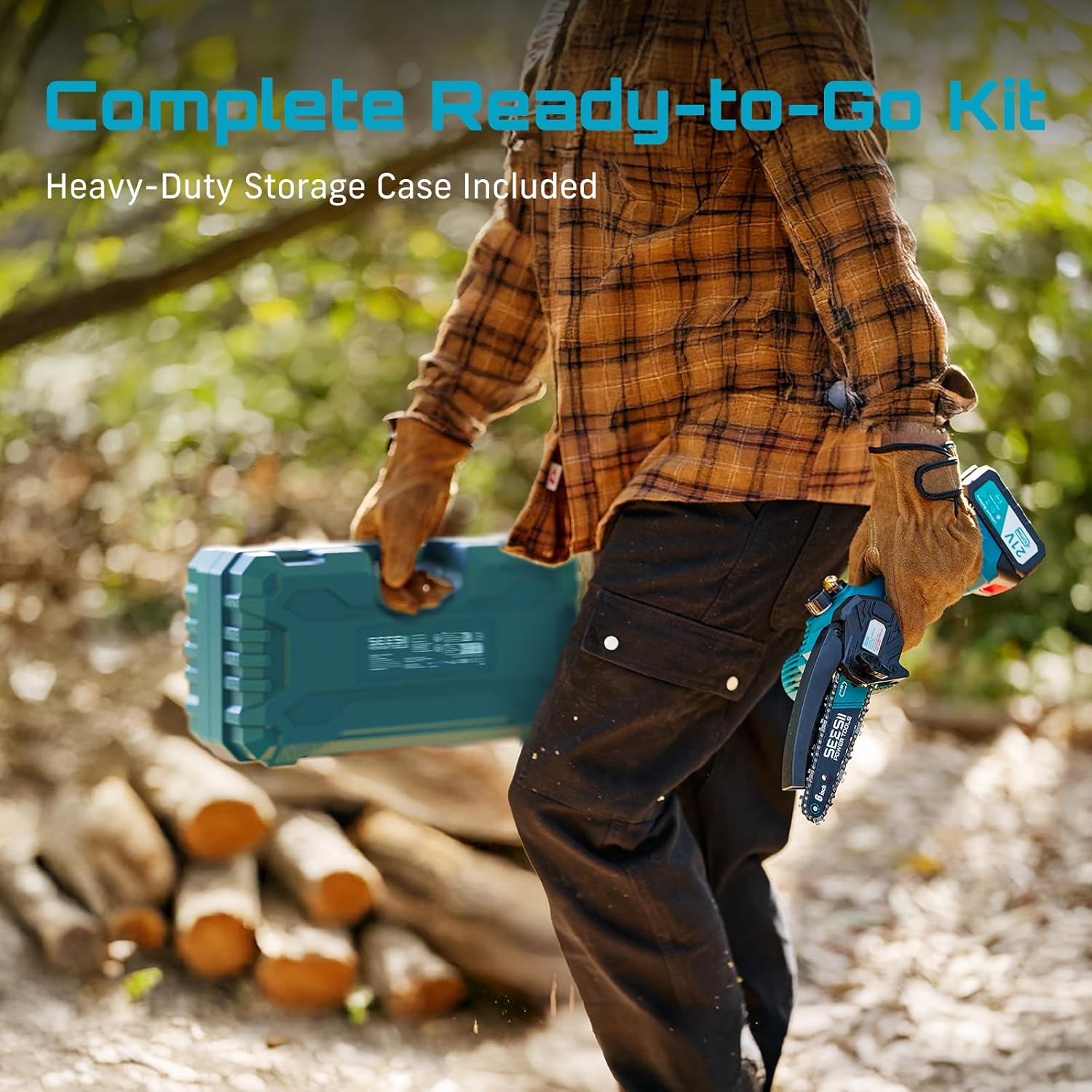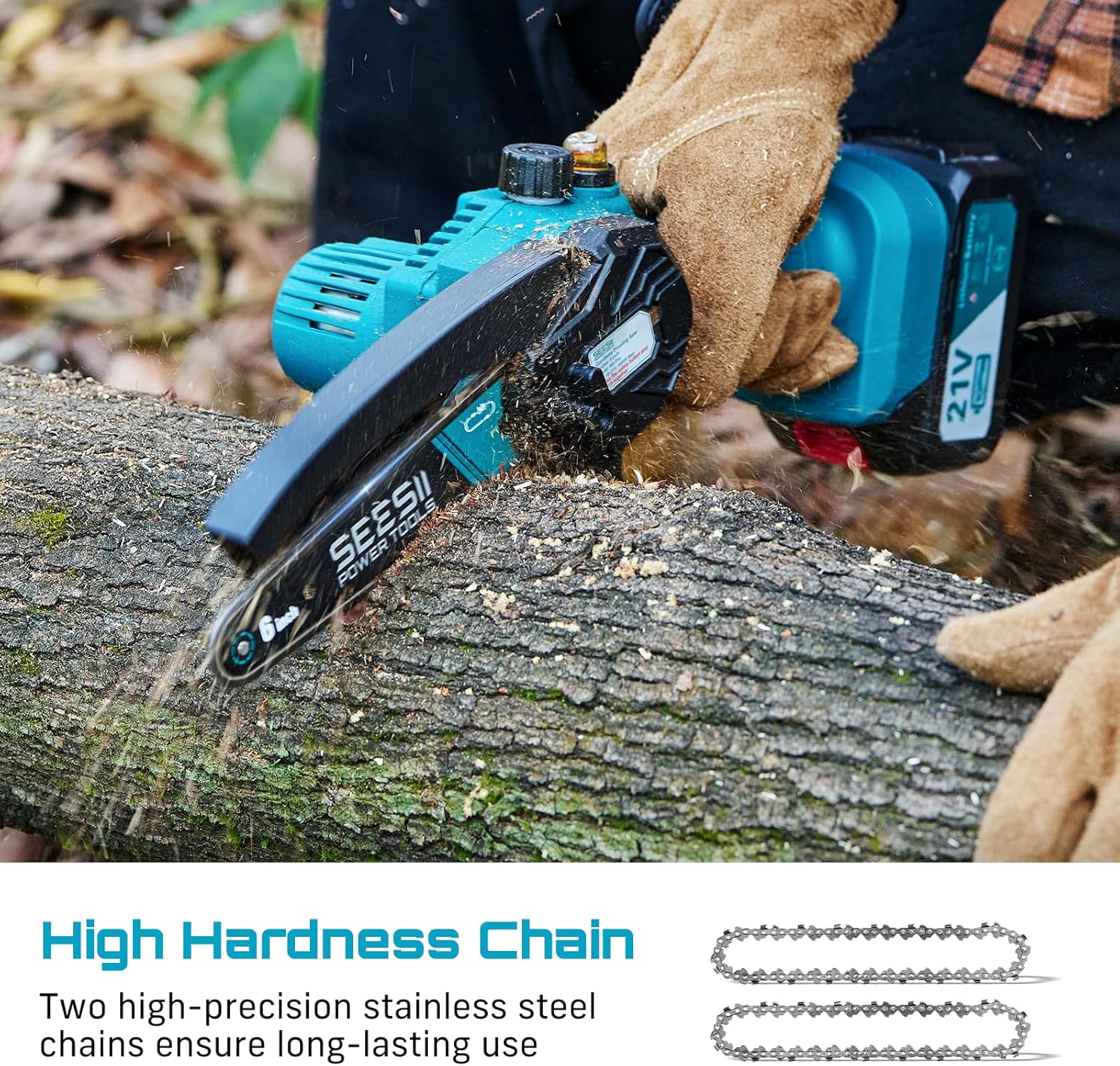 Die Mini-Kettensäge mit Akku löst das Problem von Motorabgasen und kurzer Akkulaufzeit. Sie spart Zeit und Mühe: Machen Sie sich keine Gedanken mehr um die Gartengestaltung? Mit der kabellosen Seesii-Kettensäge gehören monatelanges Ästeschneiden der Vergangenheit an. Gezielte Äste in Gärten, Höfen und Wäldern lassen sich schnell und einfach schneiden. Sie ist effizienter, leichter, robuster und eignet sich für Anfänger, Frauen und Senioren gleichermaßen. Hocheffizientes Schneiden: Diese 15 cm Mini-Akku-Kettensäge ist mit einem Öltank zur Schmierung ausgestattet. Die Kette wird automatisch geschmiert, wodurch der Reibungswiderstand beim Sägen reduziert und ein sauberer Schnitt ermöglicht wird. Der leistungsstarke 800-W-Motor aus reinem Kupfer erreicht eine Geschwindigkeit von bis zu 7 m/s. Das Durchtrennen eines Baumstamms mit 10 cm Durchmesser dauert nur etwa 5 Sekunden – so einfach wie Butter schneiden. Herausragende Akkulaufzeit: Wir wissen, dass die Akkulaufzeit Ihrer Kettensäge für Sie von größter Bedeutung ist. Unsere Kettensäge ist mit zwei 21-V-Akkus (2 x 4000 mAh) ausgestattet, mit denen Sie über 100 Holzstücke am Stück durchtrennen können. Ein Überhitzungsschutz sorgt für eine besonders lange Akkulaufzeit. Die Akkuanzeige befindet sich direkt am Akku, sodass Sie den Ladezustand jederzeit bequem überprüfen können. Mehr Sicherheit und weniger Lärm: Diese Mini-Kettensäge mit Akku verfügt über eine Sicherheitsverriegelung und einen Spritzschutz. Um ein versehentliches Starten zu verhindern, müssen Sicherheitsverriegelung und Auslöser gleichzeitig betätigt werden. Der Spritzschutz verhindert, dass Sägemehl während des Betriebs herausspritzt. Dank des sehr geringen Geräuschpegels stören Sie Ihre Nachbarn nicht. Wartungsfreundlich: Mit UL/CE/FCC/ETL-Zertifizierung ist diese Mini-Kettensäge jahrelang einsetzbar. Sie ist leicht zu verstauen und kostengünstig in der Wartung. Ein einfaches Schärfen der Kette und eine Flasche Kettenöl genügen in der Regel, um die Säge viele Jahre einsatzbereit zu halten. Das ideale Geschenk für Familie und Freunde, die gerne selbst Hand anlegen. Marke: Seesii Antrieb: Akkubetrieb Leistung: 2 PS Gewicht: 1,4 kg Abmessungen: 19 x 15 x 40 cm (L x B x H) Kettenlänge: 15 cm Kettengeschwindigkeit: 5 m/s Artikelnummer: AS-00155 GTIN: 04262549931382